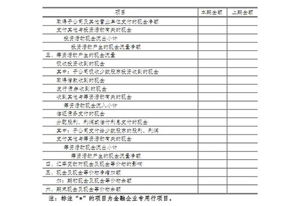 3、金融企业现金流量表中“回购业务资金净增加额”行项目(保险公司专用)在本表中的“收到其他与筹资活动有关的现金”行项目中列示。