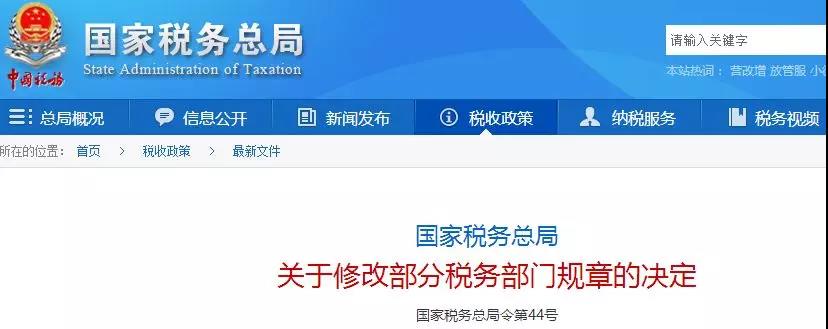 《国家税务总局关于修改部分税务部门规章的决定》,已经2018年6月5日国家税务总局2018年度第1次局务会议审议通过,现予公布,自公布之日起施行。