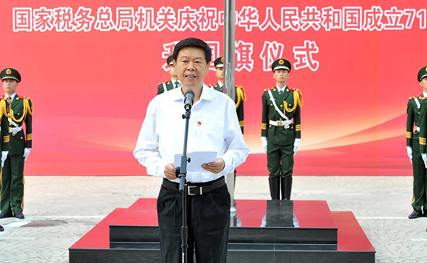 升旗礼毕,王军发表致辞。他指出,新中国成立以来,中国共产党团结带领全国各族人民取得了举世瞩目的伟大成就。特别是今年以来,面对新冠肺炎疫情带来的严峻挑战,以习近平同志为核心的党中央沉着应对、科学部署,统揽全局、果断决策,取得了抗击疫情和经济社会发展的两大战略胜利,充分展现了中国精神、中国力量和中国担当。在这一过程中,全国税务系统坚决贯彻党中央、国务院决策部署,紧紧围绕优惠政策落实要给力、“非接触式”办税要添力、数据服务大局要加力、疫情防控工作要尽力的“四力”要求,坚守岗位、奋战一线、合力拼搏,用实际行动践行了初心使命,彰显了担当作为。